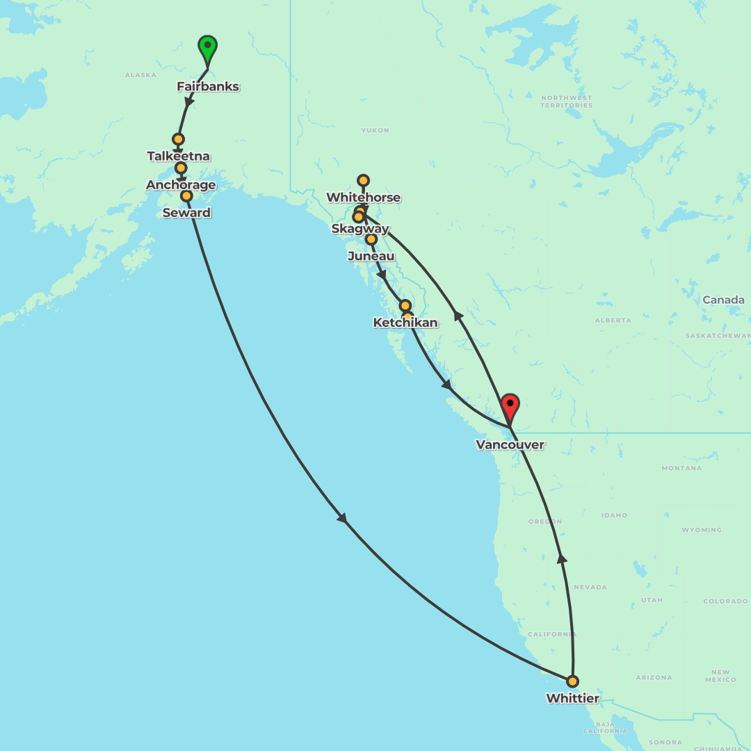 Journey from Fairbanks to Denali and Seward, then enjoy a 7-night Inside Passage cruise to Vancouver featuring Glacier Bay and ports including Skagway, Juneau, and Ketchikan.