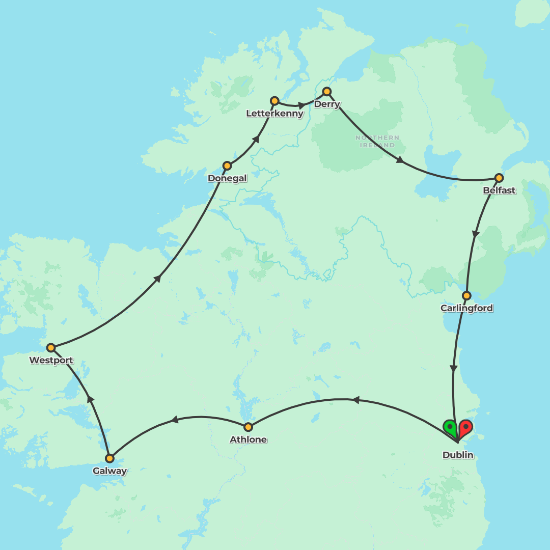 Discover Dublin, Galway, Letterkenny, and Belfast, with highlights including Rathbaun Farm, the Giant’s Causeway, and Titanic Belfast, on a 7-day itinerary featuring 6 breakfasts and 2 dinners.