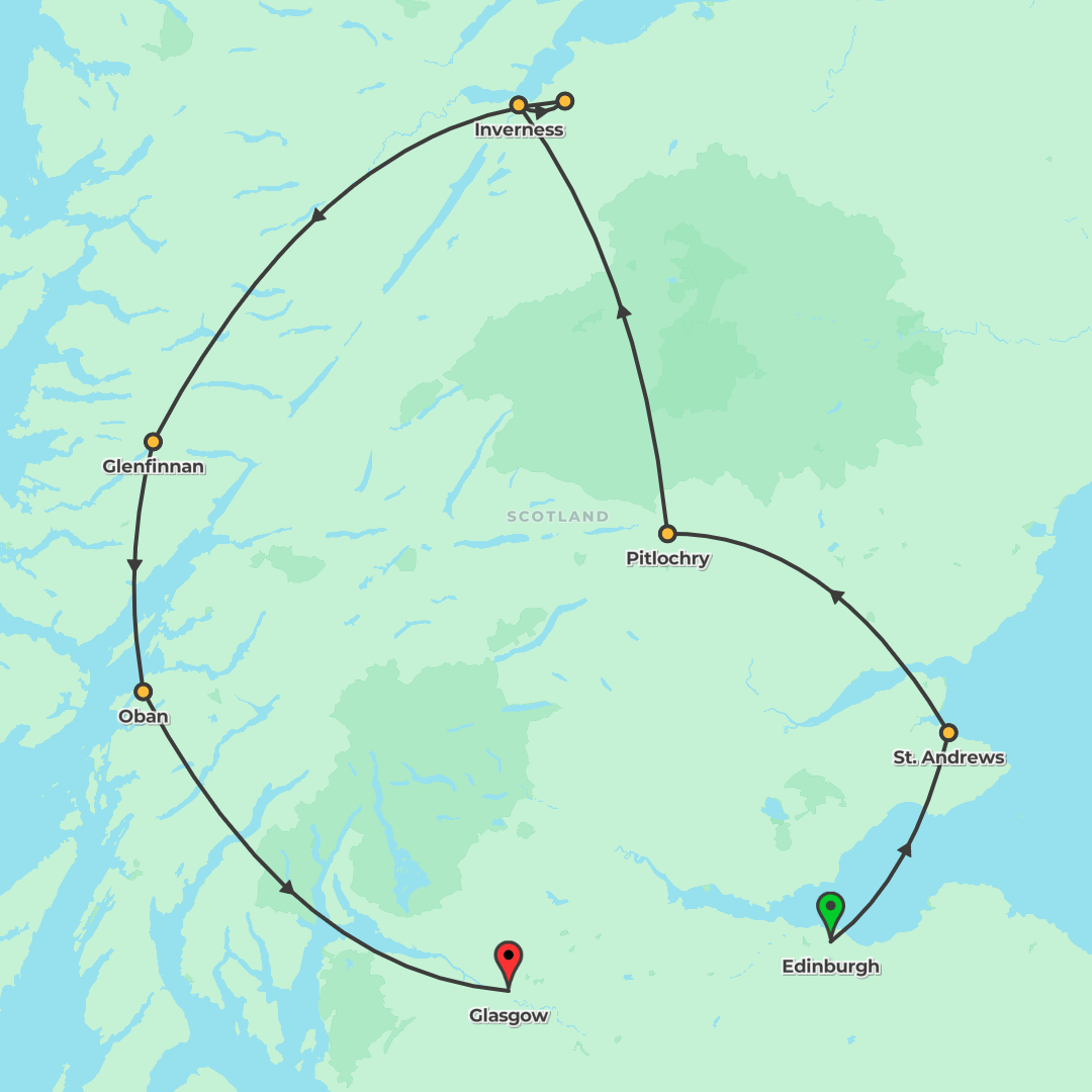 Explore Scotland from Edinburgh to Glasgow via Inverness, Loch Ness and The Trossachs on a first-class, fully guided escape featuring Edinburgh Castle, Culloden and a local whisky distillery.