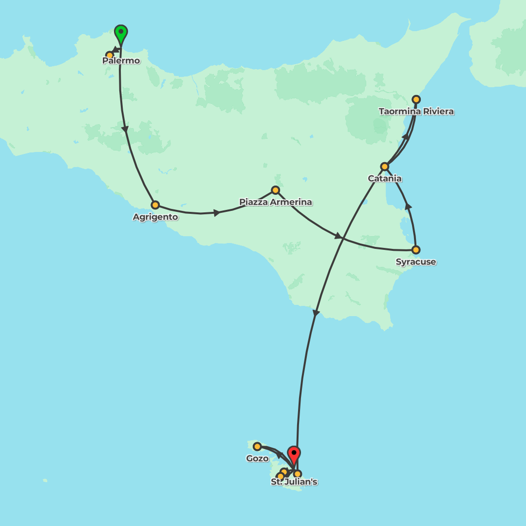Experience a 14‑day journey across Sicily’s highlights with Local Experts, then fly to Malta for relaxed exploration from Sliema, including Valletta and Mdina.
