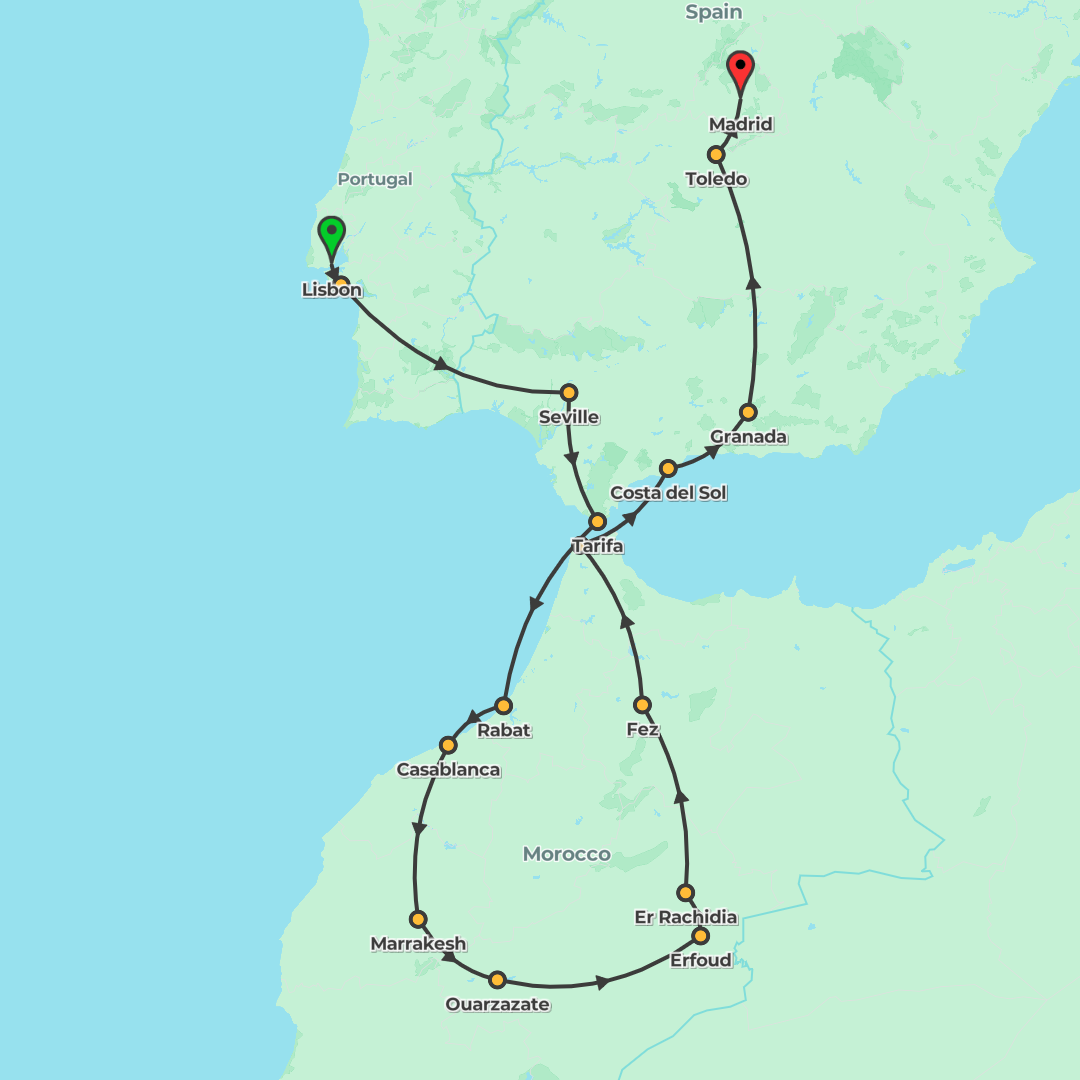 Explore the vibrant cultures of Spain, Portugal, and Morocco on this 32-day adventure, featuring iconic cities, stunning landscapes, and rich history.