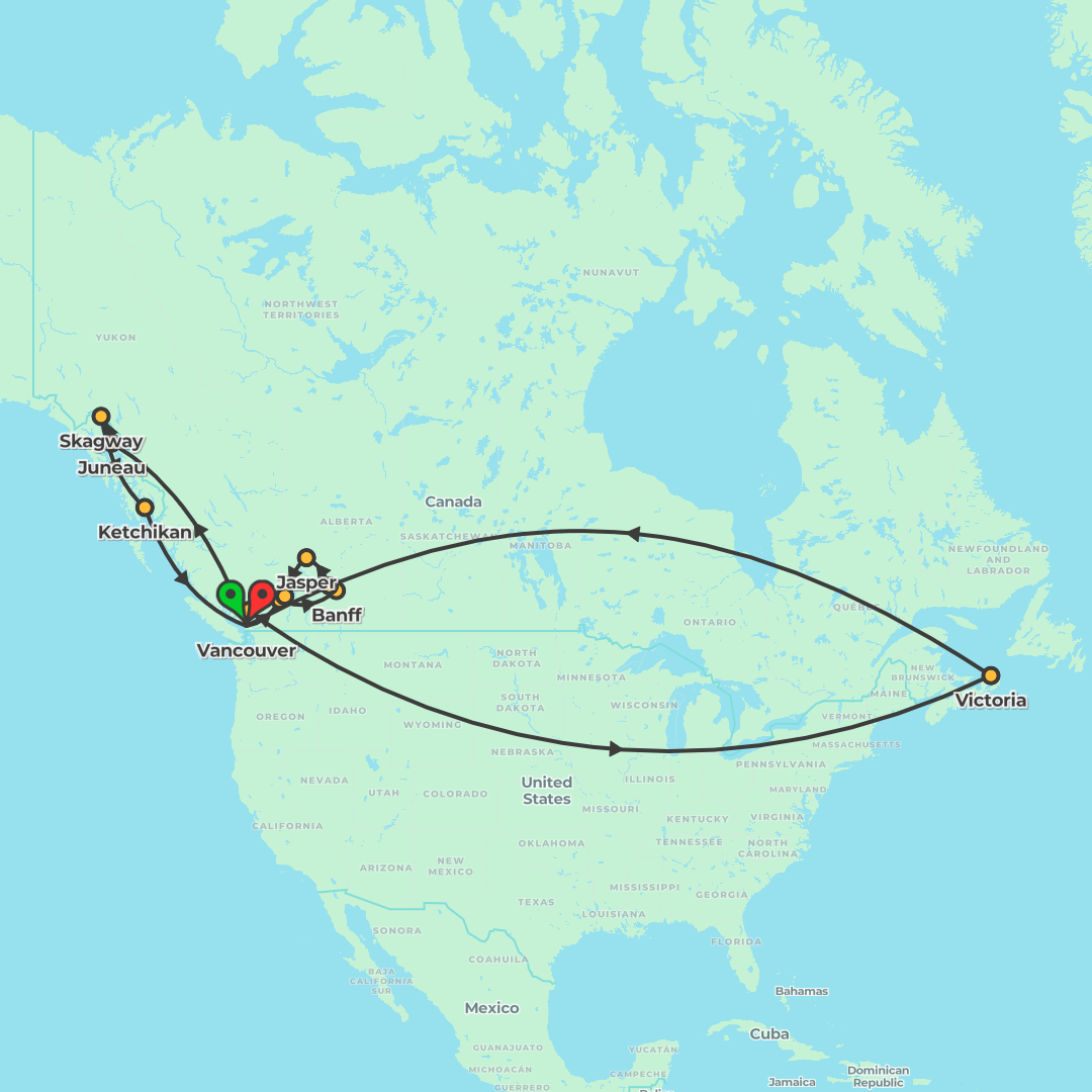 Journey from Vancouver through Victoria and the Canadian Rockies to Glacier National Park, ending in Seattle on a small-group, fully guided adventure featuring Maligne Lake, the Icefields Parkway and