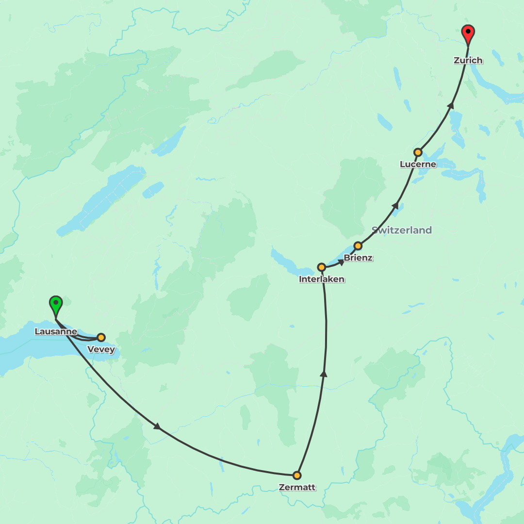 Discover Switzerland by train from Lake Geneva to Zermatt, Interlaken, and Lucerne, featuring the Gornergrat and Jungfraujoch ascents and a tranquil cruise on Lake Brienz.