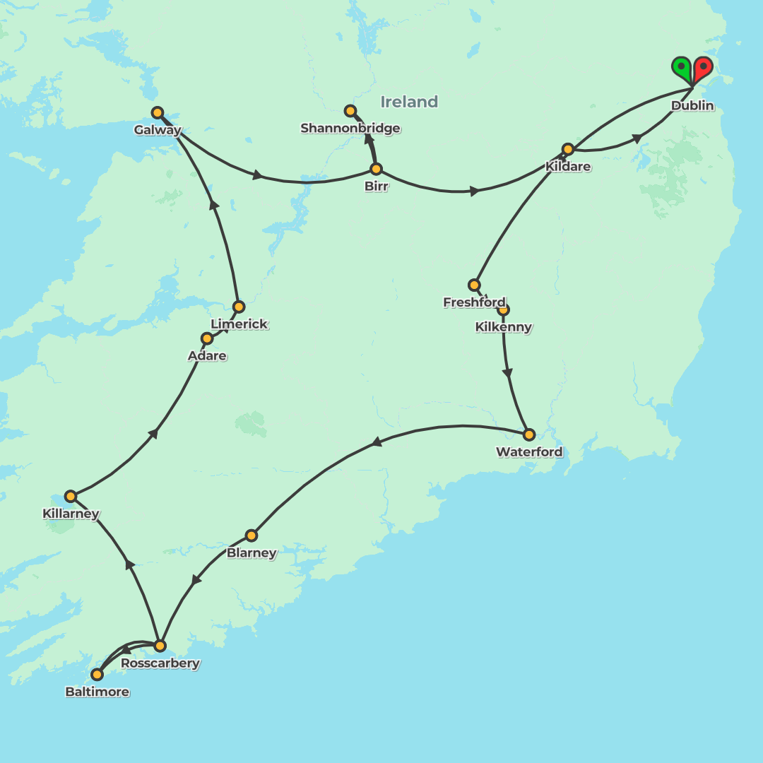 Experience a 10-day exploration of Ireland from Dublin to Waterford, Rosscarbery, Limerick, and Birr, featuring Cape Clear Island by ferry, the Ring of Kerry, the Cliffs of Moher, and time at leisure.