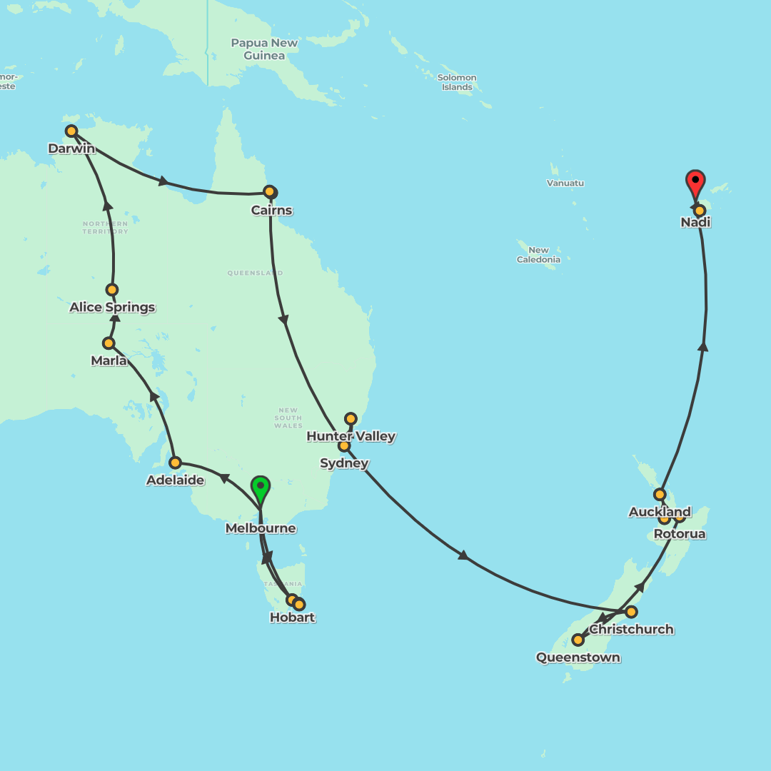 A 22-day guided journey from Melbourne to Christchurch, discovering Uluru, the Great Barrier Reef, Sydney, Auckland, Rotorua, Queenstown and Lake Tekapo with cultural experiences and memorable cruises