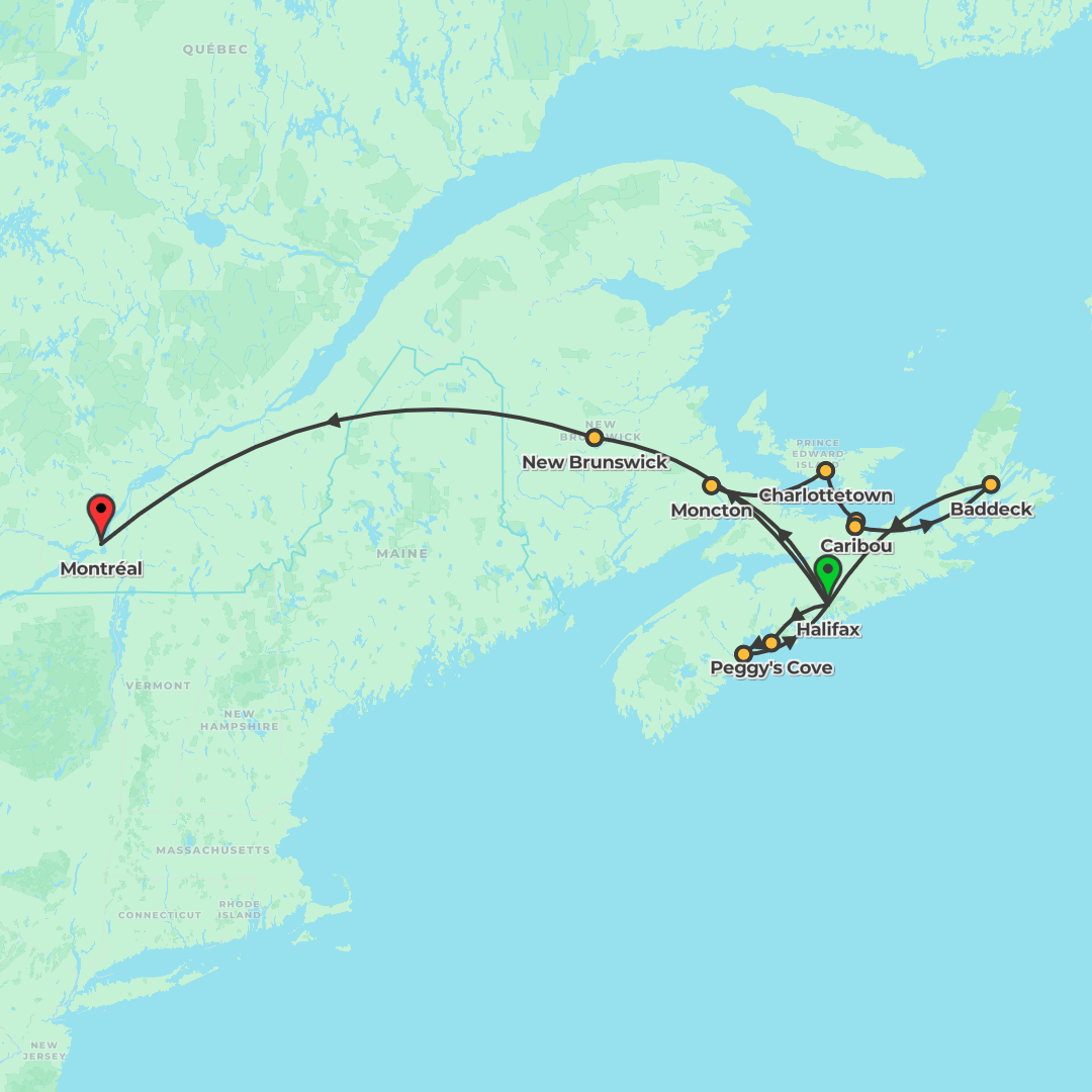 Discover the Maritimes’ coastal wonders and culture before an overnight rail journey delivers you to vibrant Montréal.
