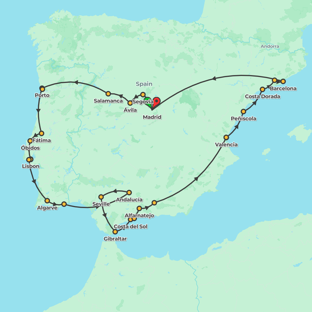 Discover Spain and Portugal from Madrid to Lisbon and Porto with guided city tours, UNESCO-listed highlights, scenic drives, and daily breakfasts plus three dinners across a 13-day itinerary.