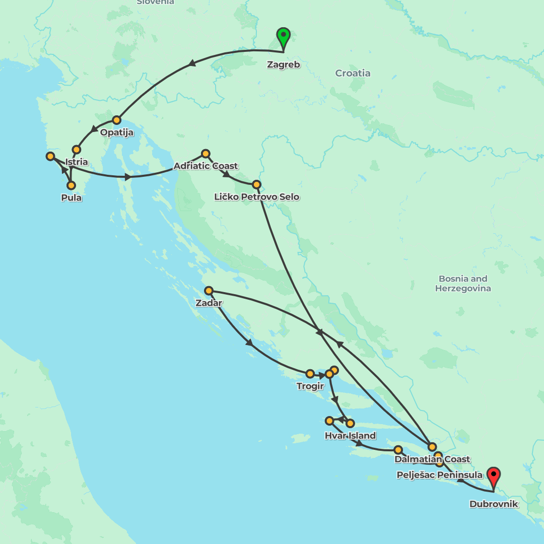 Explore Zagreb, Lake Bled, Ljubljana, Opatija, Pula, Rovinj, Plitvice Lakes, Trogir, Split and Dubrovnik on a fully guided trip featuring cherry-picked hotels, a luxury air-conditioned coach, Local Sp