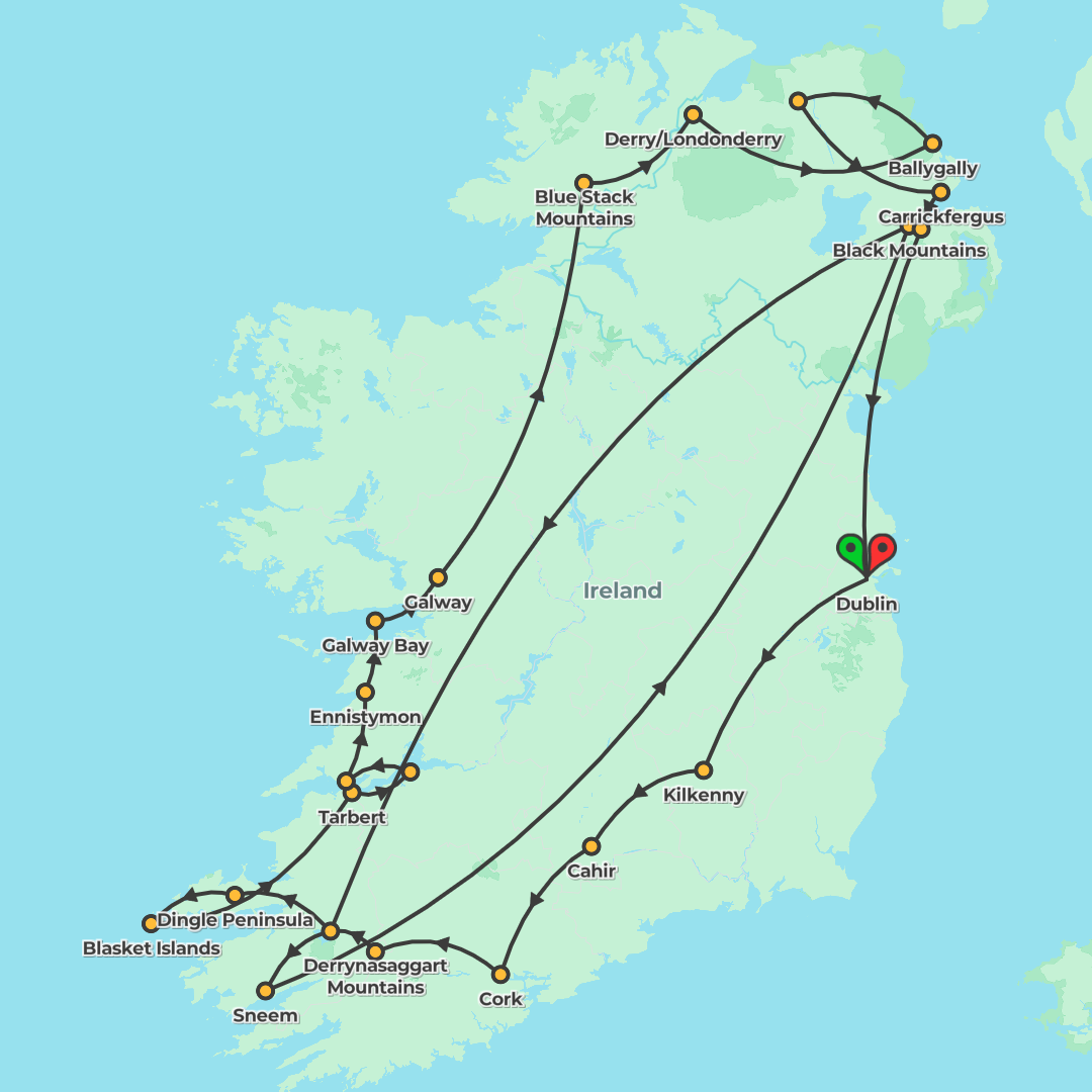 Discover Ireland and Northern Ireland on a 12-day journey from Dublin with scenic routes, iconic castles, coastal wonders and cultural insights, ending back in the capital.