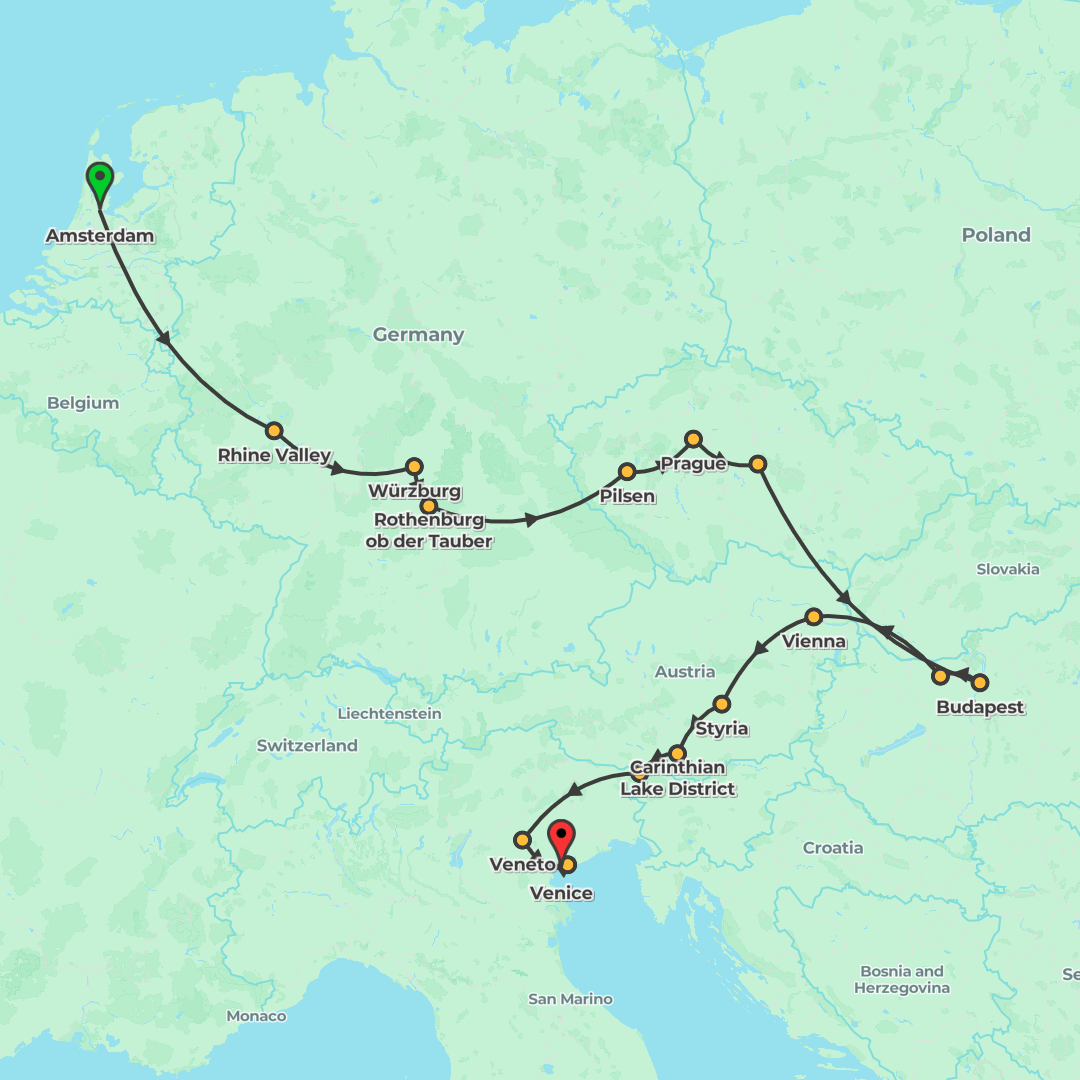 From Amsterdam to Venice, discover the Rhine Valley, Rothenburg, Prague, Budapest and Vienna with Local Experts, authentic dining experiences and a private boat arrival to your Venice hotel.