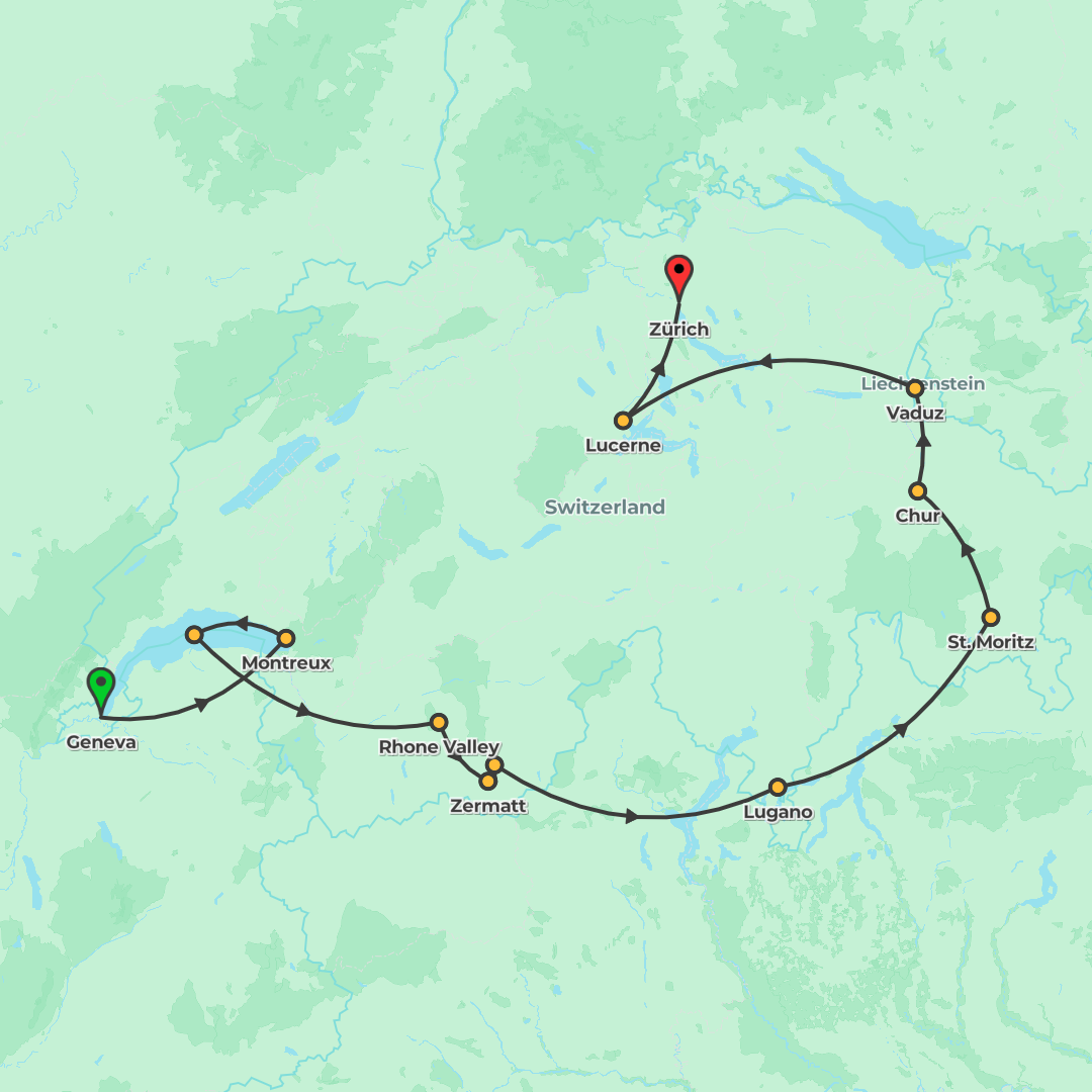 Discover Switzerland’s highlights from Geneva to Zurich with classic stays in Zermatt, St. Moritz and Lucerne, a Glacier Express segment, and a solar-powered cable car to Mount Stanserhorn.
