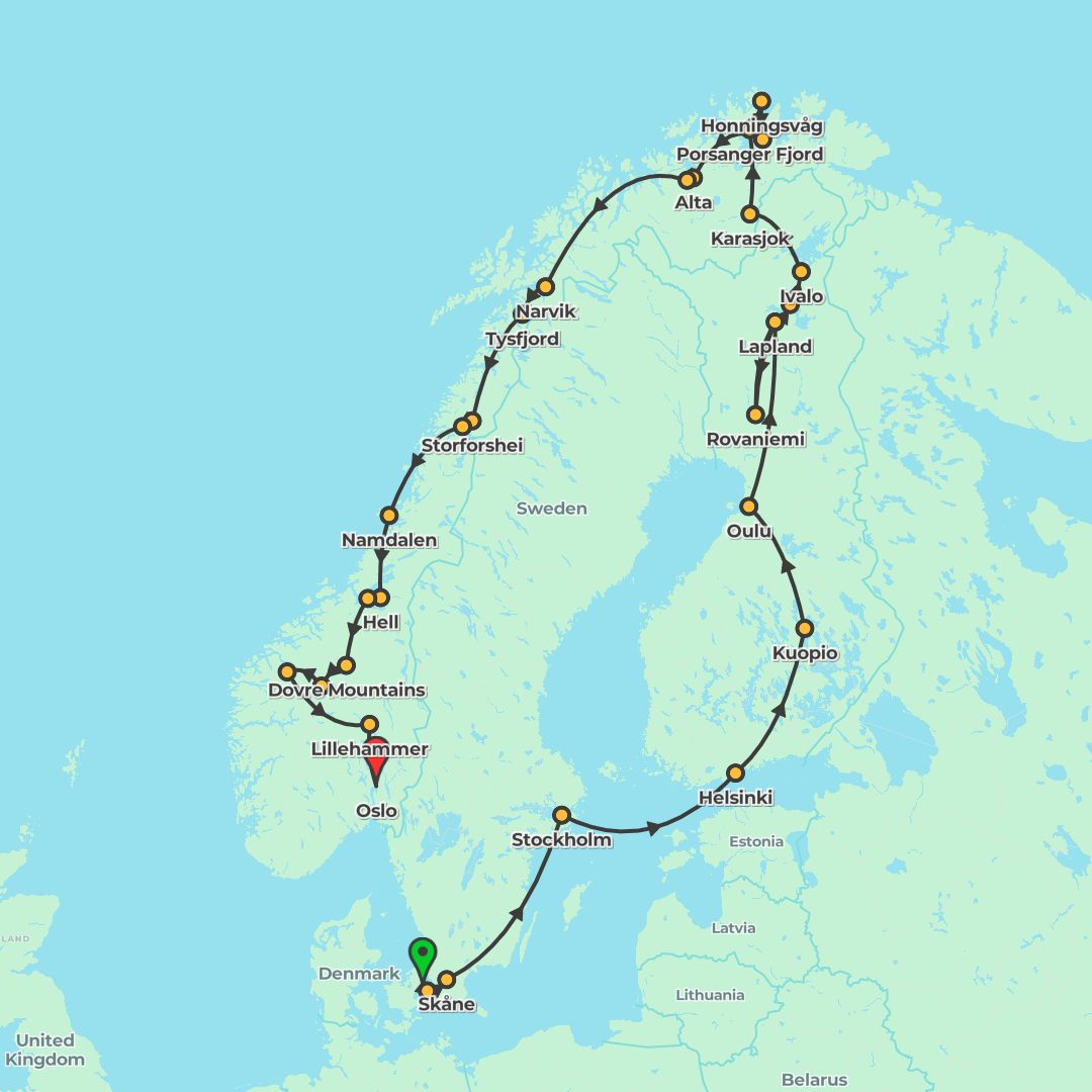 Experience Denmark, Sweden, Finland and Norway on a classic three‑week journey, crossing the Øresund Bridge, cruising overnight to Helsinki, venturing through Lapland to the North Cape, and concluding