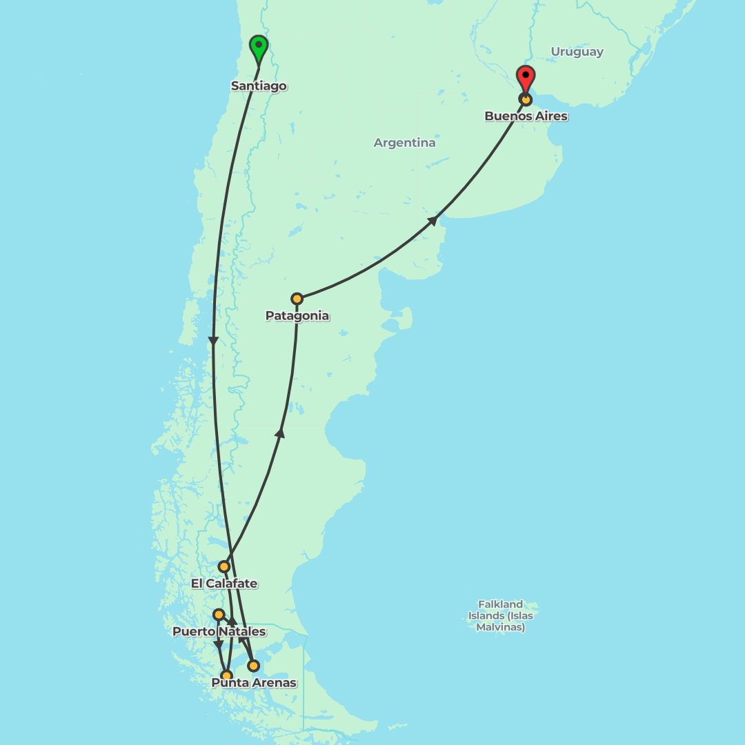 Travel from Santiago to Buenos Aires on a guided Patagonia journey featuring Torres del Paine, Los Glaciares, fjord and lake cruises, and time in Puerto Natales and El Calafate.