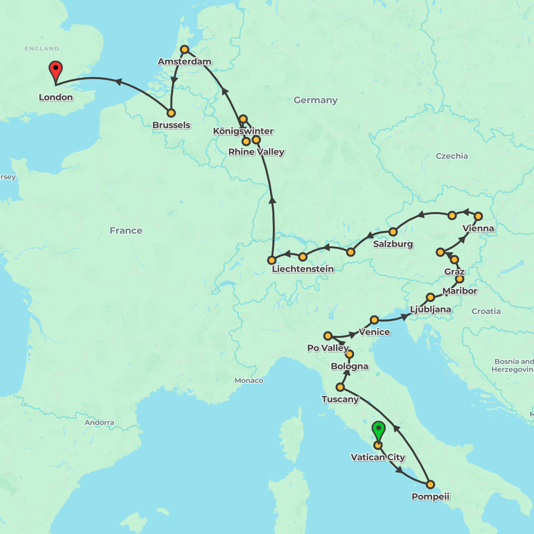 A 2-week guided journey from Rome to Amsterdam featuring the Vatican, Venice at sunset, Slovenia and Austria, Alpine scenery to Switzerland, a private Rhine castle visit, and a solar-powered cable car