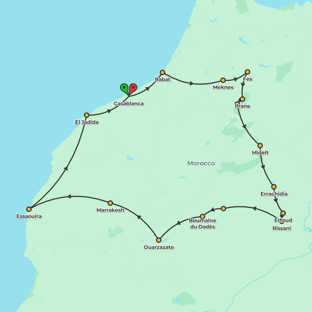 A 14-day Morocco journey from Casablanca to Marrakech with 4-star stays, guided highlights, a Sahara desert camp, and scenic coach travel along cities, mountains, and coast.