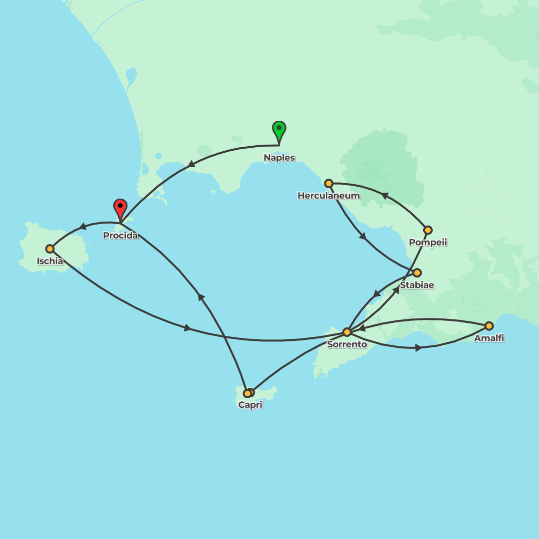 Sail the Amalfi Coast from Naples to Procida with a local skipper, exploring Ischia, Sorrento, Pompeii, Amalfi and Capri’s grottos by day and sleeping aboard your yacht each night.