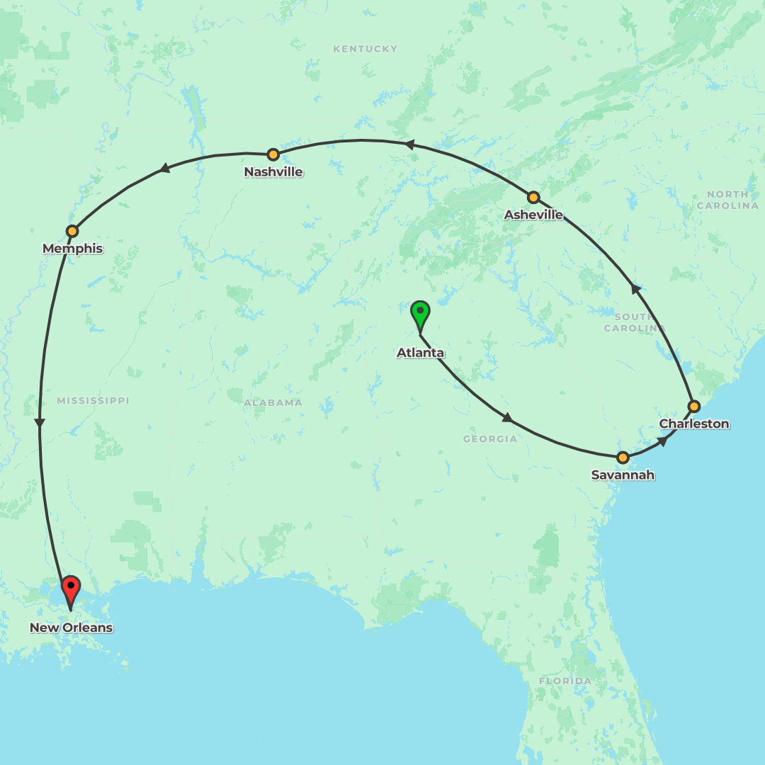 Journey from Atlanta to New Orleans through Savannah, Charleston, Asheville, Nashville and Memphis on a leader-led Southern odyssey of music, history and cuisine.