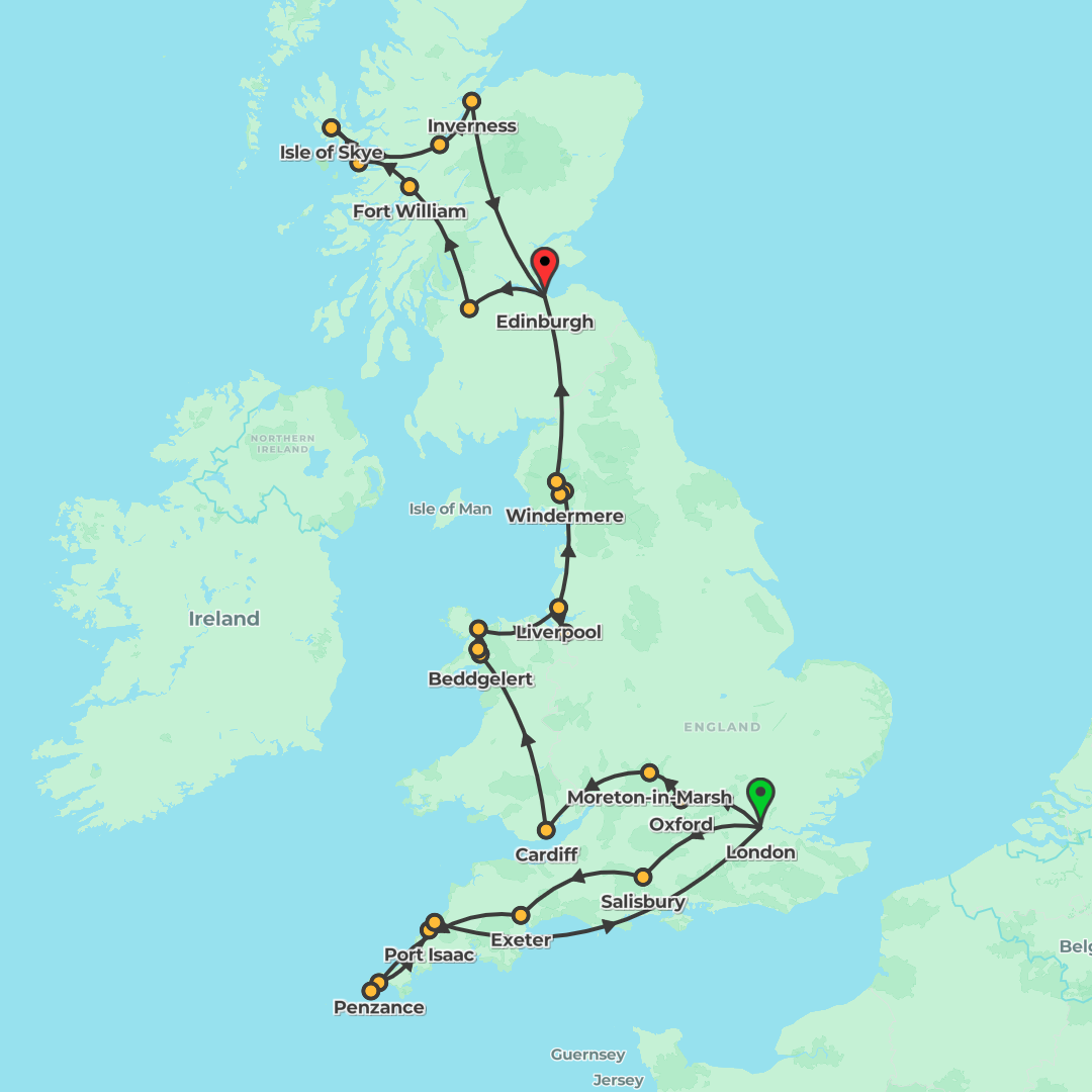 Set off on an epic four-week adventure through the very best of the UK – including London, Cornwall, Dartmoor National Park, Oxford, Cardiff, Snowdonia, Liverpool, the Lakes District, Edinburgh, Glasg