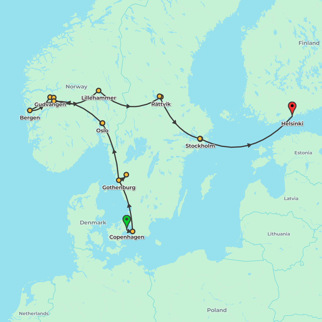 From Copenhagen to Helsinki, this 21-day Complete Scandinavia tour links Denmark, Sweden, Norway and Finland with local transport, guided city walks and fjord, island and village experiences.