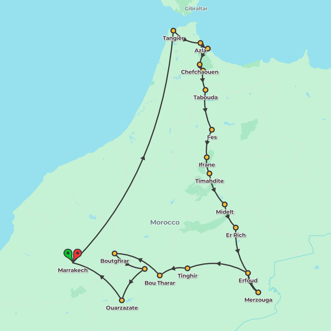 Discover Morocco on a 15-day round-trip from Marrakech featuring guided city tours, Chefchaouen, Fes, a Sahara camel trek with Berber camp stay, Todra Gorge, Aït Benhaddou and Essaouira.