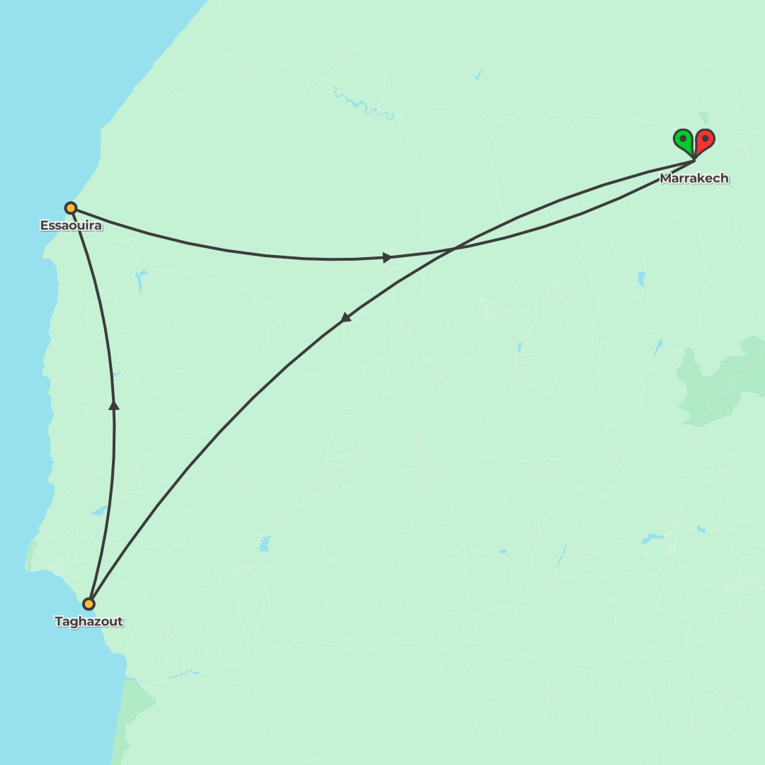 A fast-paced small-group journey from Marrakech to the coast and back, featuring Taghazout surf lessons, a beach bonfire, and an Essaouira orientation walk.