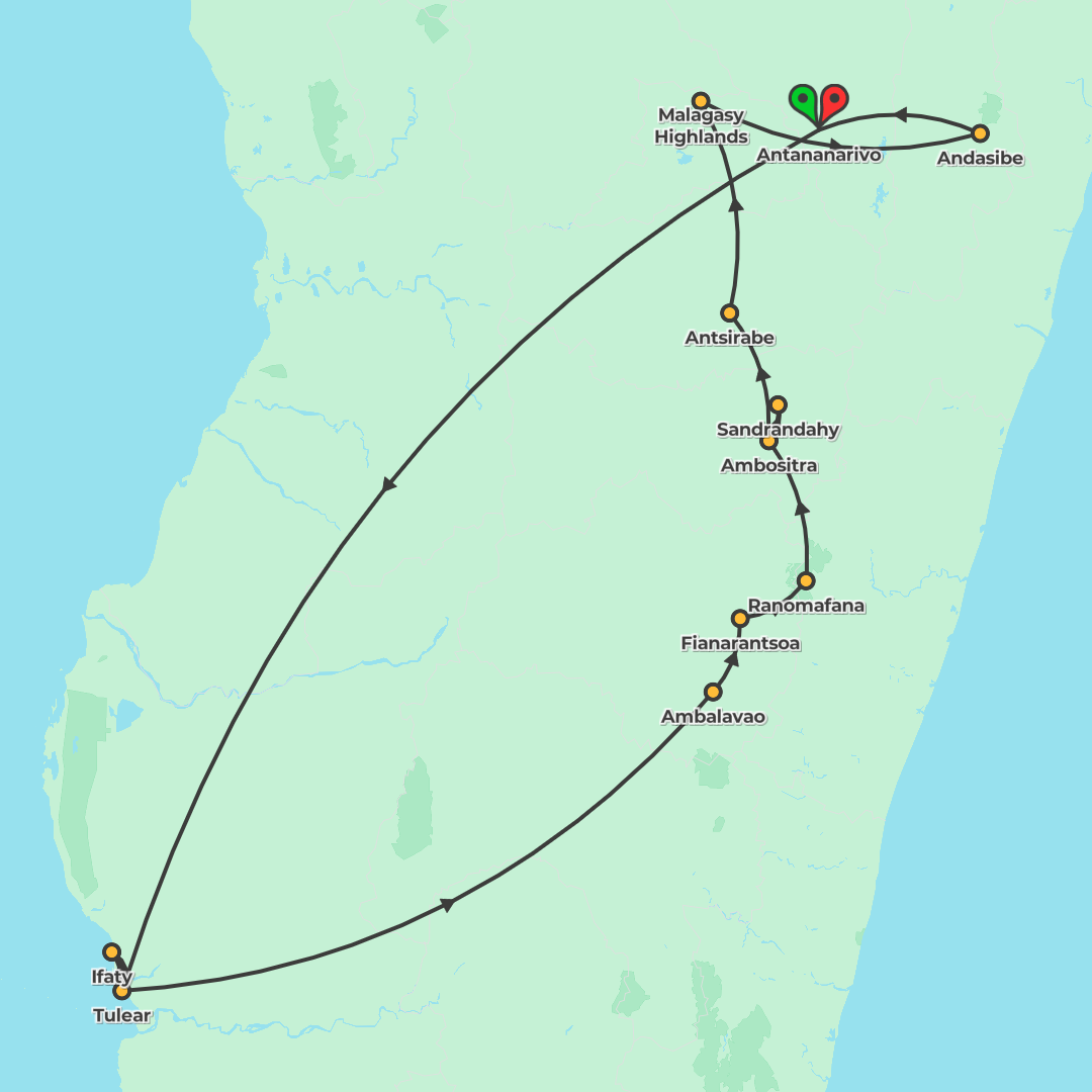Explore Madagascar’s wildlife and scenery on a 15-day itinerary from Antananarivo to Andasibe, Ranomafana, Isalo and Ifaty, featuring rainforest walks, cultural visits and a domestic flight back to th