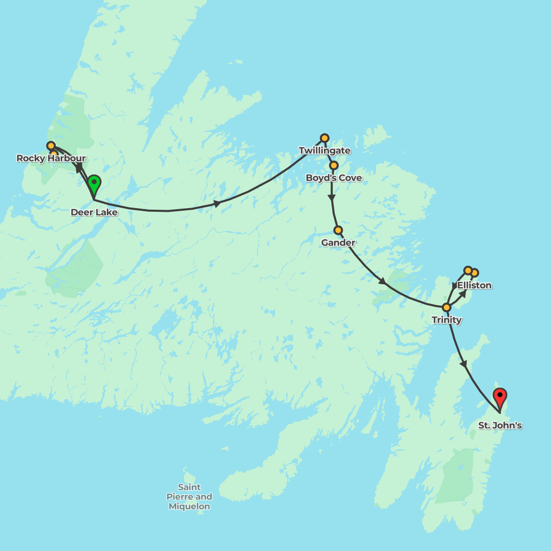 Journey east across Newfoundland from Deer Lake to St. John’s, discovering Gros Morne’s Western Brook Pond, Twillingate wildlife cruises, historic Trinity, puffins at Elliston and Cape Spear views.