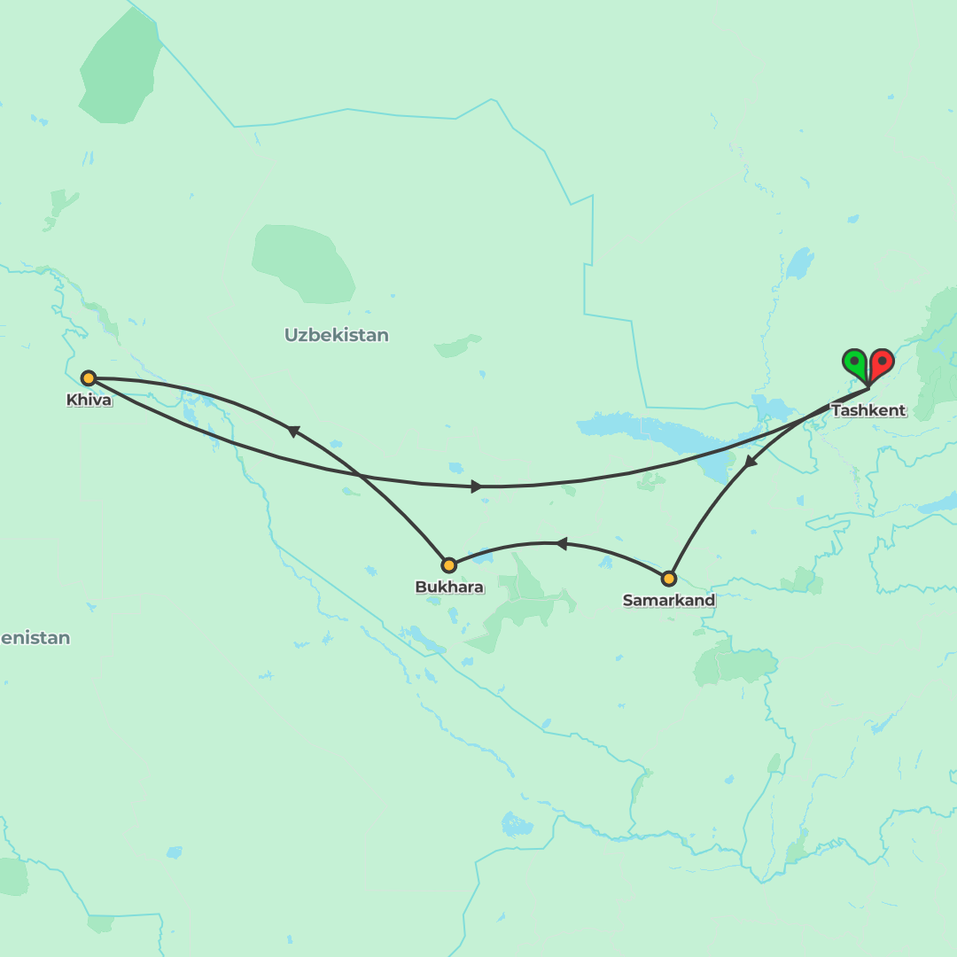 Travel across Uzbekistan’s Silk Road cities by rail and private bus, from Khiva to Bukhara, Samarkand and Tashkent, with immersive cultural experiences along the way.