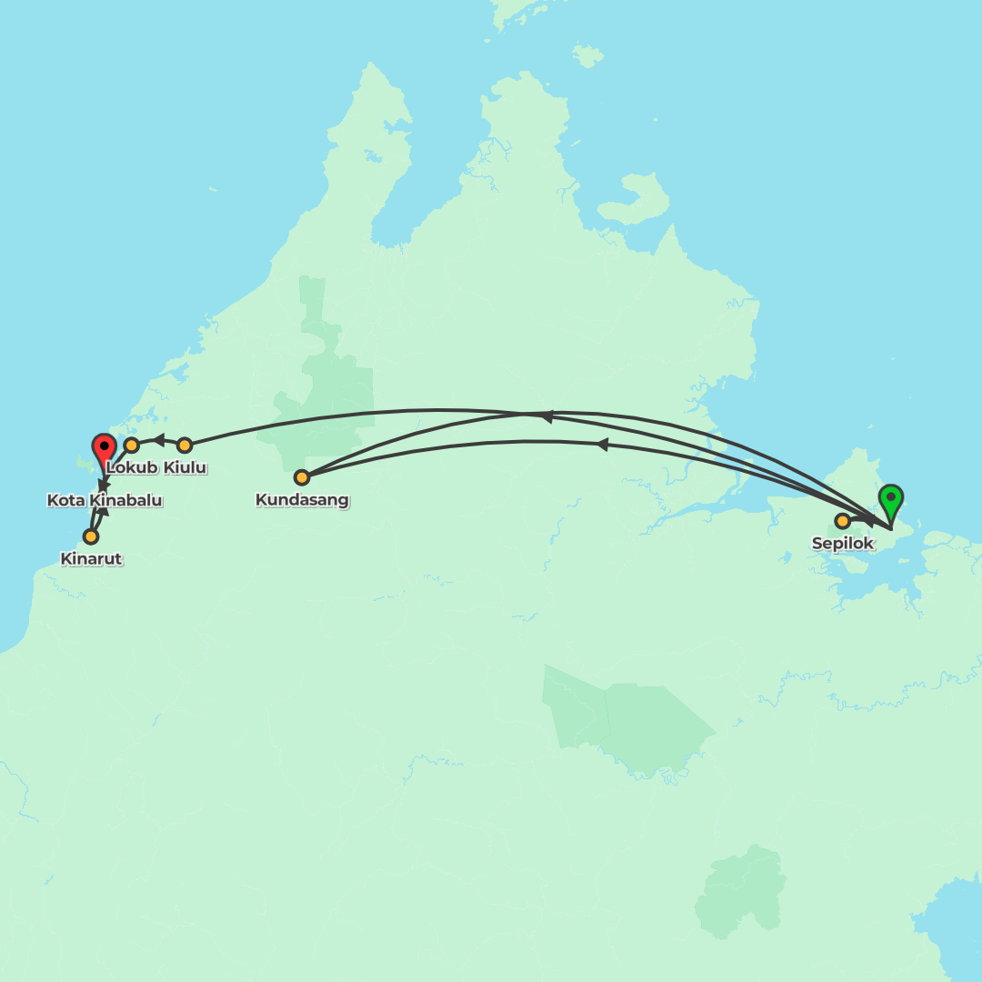 Discover Sabah’s wildlife and culture on a 10-day adventure from Sandakan to Kota Kinabalu, featuring Sepilok’s orangutans, Kinabatangan River cruises, a two-day Kiulu village trek with a night in a b