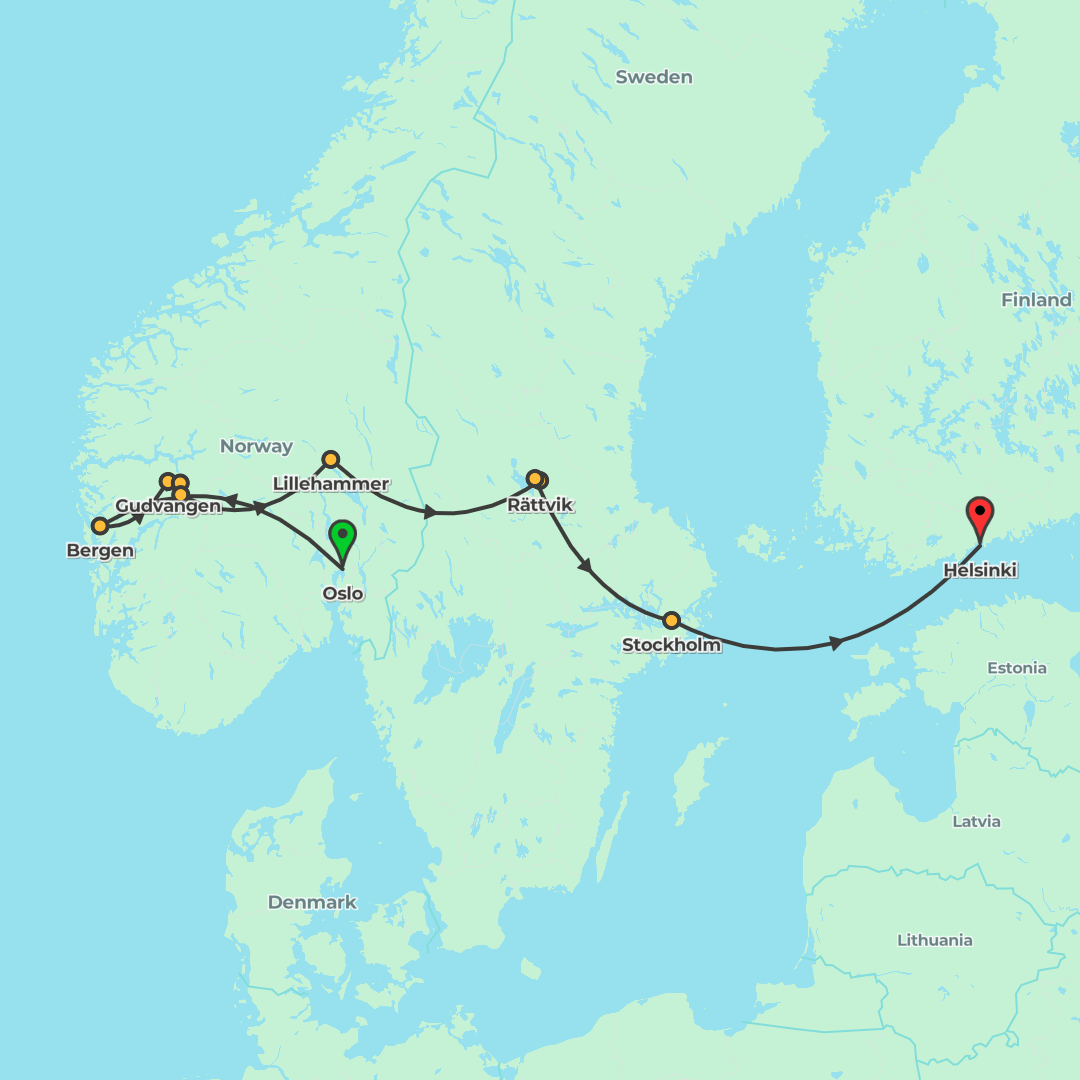 Experience the best of Norway, Sweden and Finland on a guided adventure from Oslo to Helsinki, blending scenic rail journeys with memorable boat and ferry explorations.