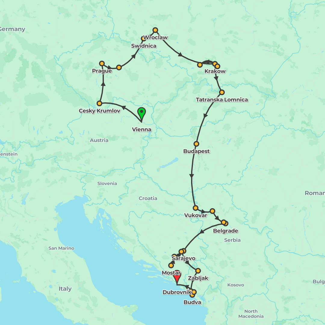 A 12-day journey from Sofia to Skopje across seven Balkan countries, featuring guided city tours, scenic drives, optional boat trips and time to explore at your own pace.