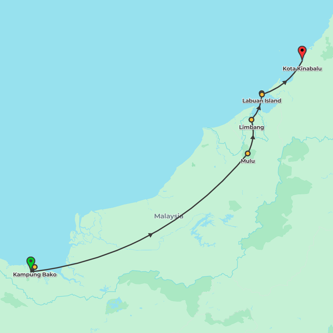 Explore Sarawak and Sabah on an 8-day adventure from Kuching to Kota Kinabalu, featuring Bako’s rainforest, Semenggoh’s orangutans, Mulu’s caves and a night in a Mongkos longhouse.