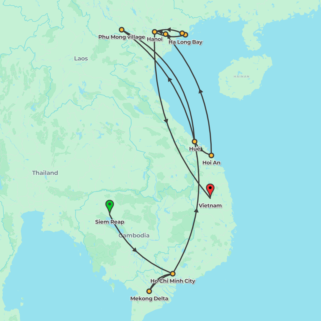 Discover Vietnam and Cambodia from Hanoi to Phnom Penh, combining city highlights, a Halong Bay cruise, cultural encounters and convenient flights between key destinations.
