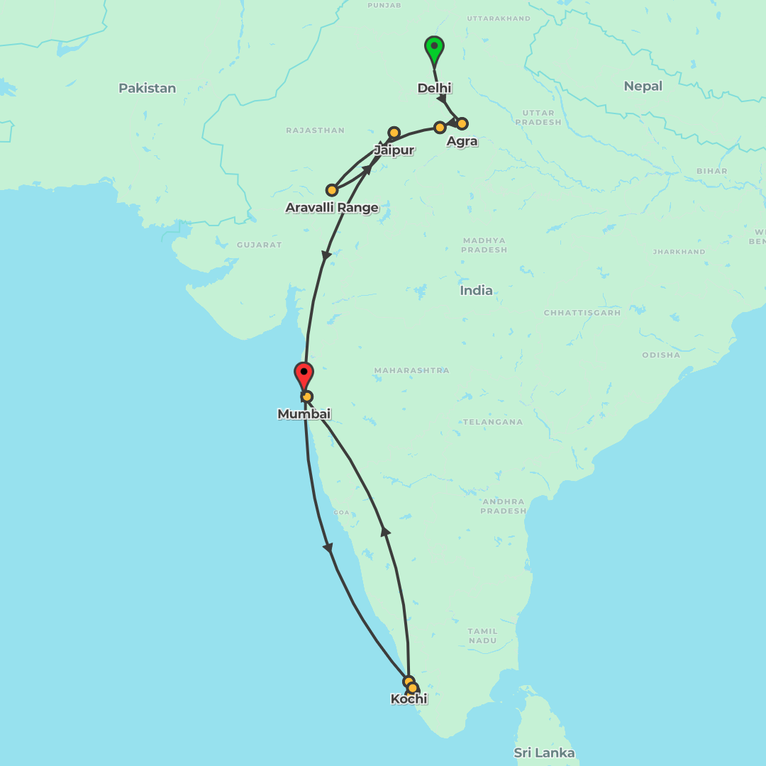 A luxury journey from Delhi to Mumbai via Agra, Ranthambore, Jaipur and Kerala, featuring curated cultural experiences, scenic train and houseboat rides, and indulgent stays at premium hotels.