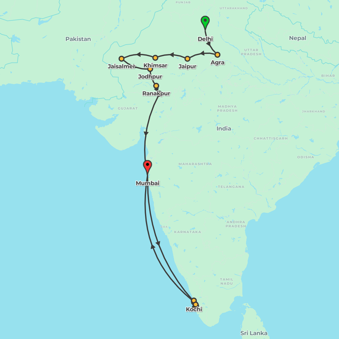 A luxury journey from Delhi to Mumbai uniting Rajasthan’s forts, Udaipur’s lakes and Kerala’s backwaters with curated dining, choice experiences and handpicked stays.