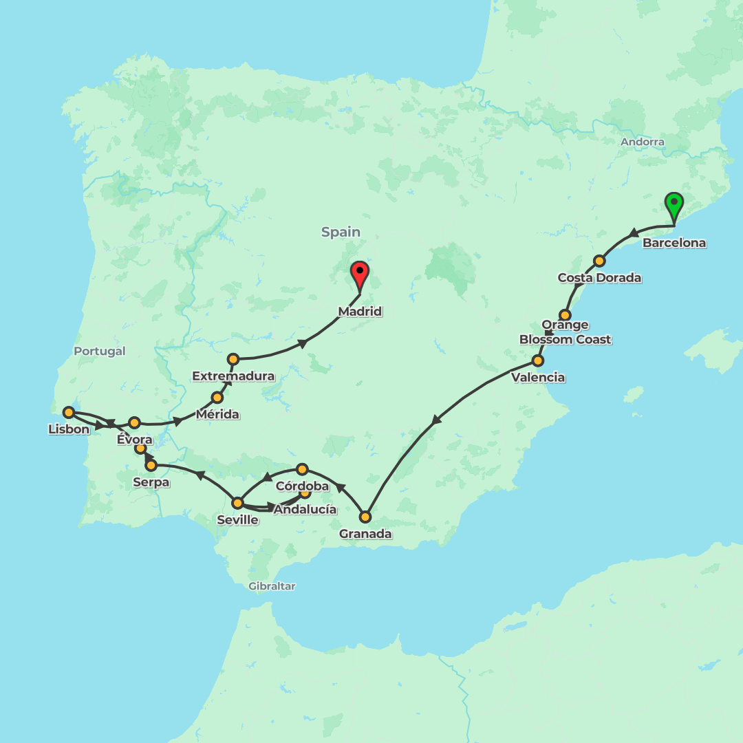 Discover Spain and Portugal on a 14-day journey from Madrid to Barcelona via Porto, Lisbon, Seville and Granada, featuring guided city highlights, iconic landmarks and local experiences.