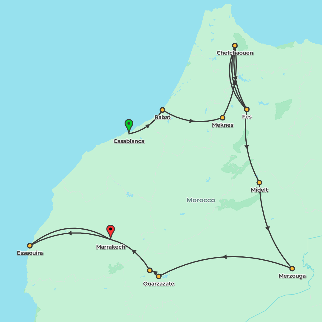 Discover Casablanca, Rabat, Chefchaouen, Fes, the Sahara, Ouarzazate and Marrakech on a guided journey of city walks, scenic drives and a sunrise camel ride before returning to Casablanca.