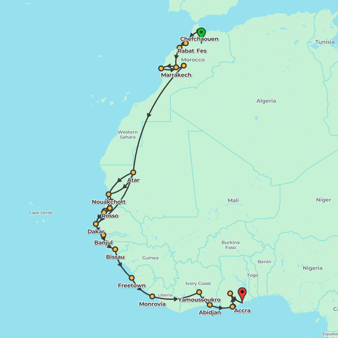 A 75-day overland expedition from Accra to Fes, camping throughout while exploring markets, rainforests, beaches, Sahel and Sahara en route to Morocco's medinas and ancient sites.