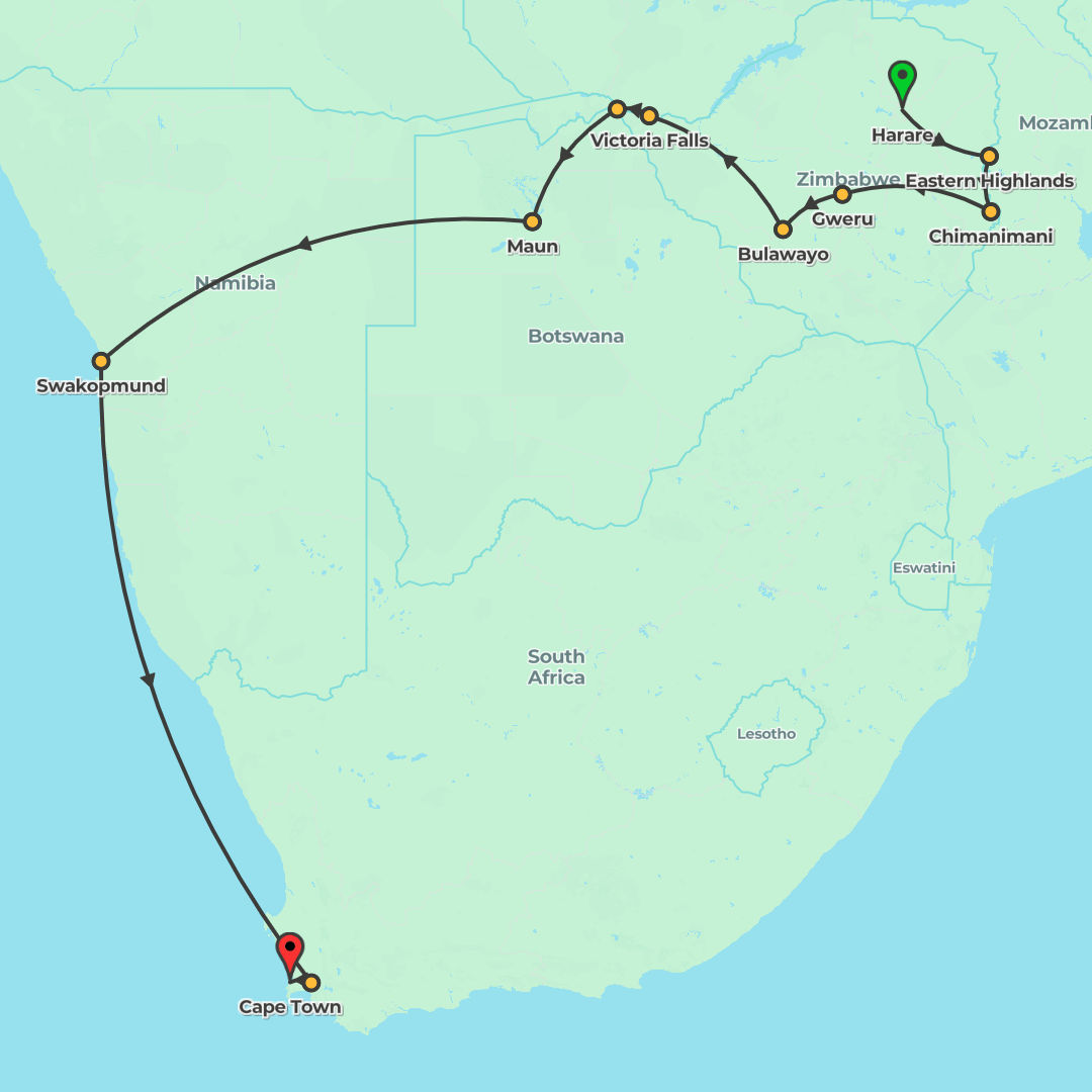 An epic 34-day overland adventure from Harare to Cape Town, camping most nights and uncovering wildlife, deltas and desert dunes across Zimbabwe, Botswana, Namibia and South Africa.