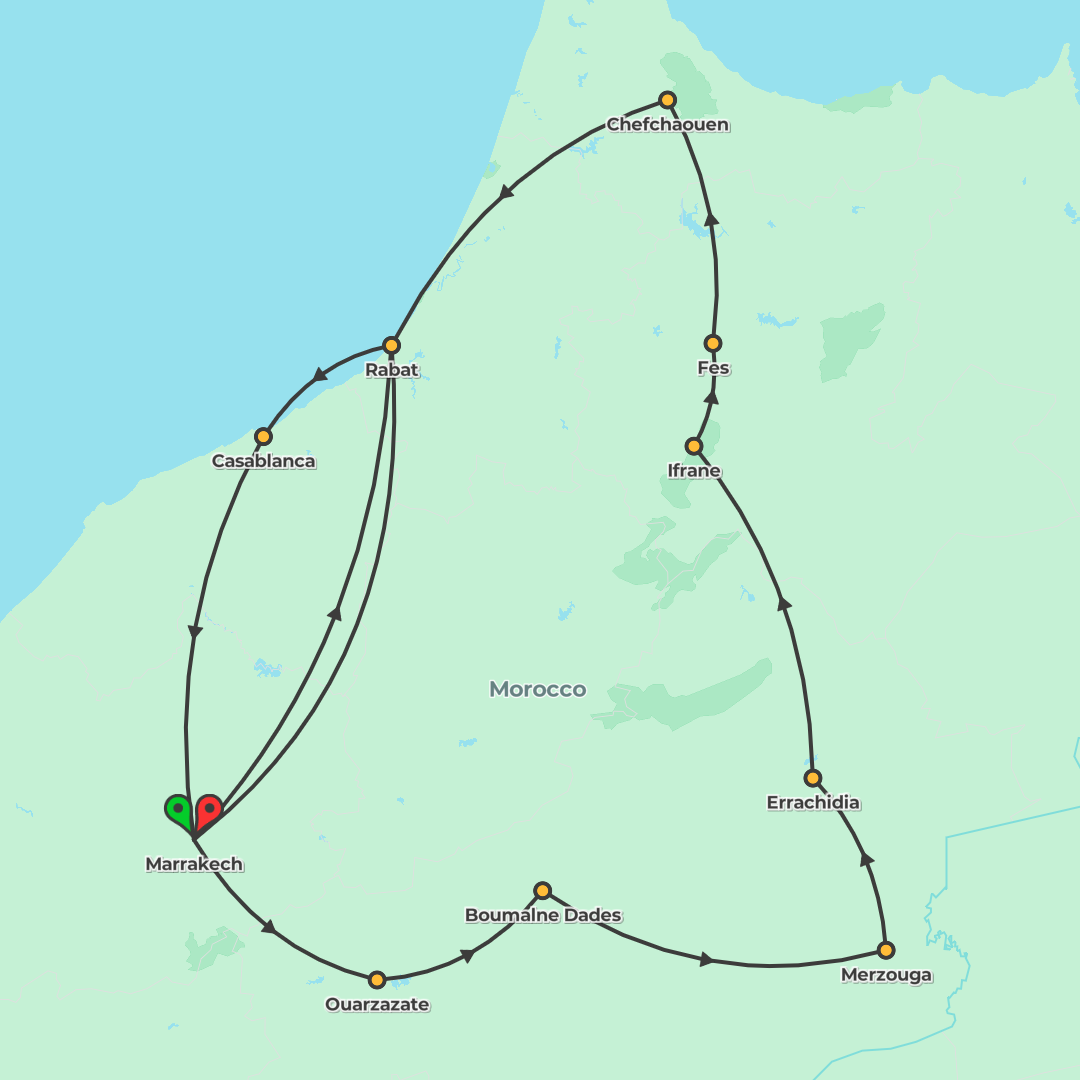 Discover Morocco's highlights on a guided circuit from Marrakech via Ait Benhaddou, the Atlas Mountains and Erg Chebbi's dunes to Fes, Chefchaouen, Rabat and Casablanca, featuring a Sahara camel trek