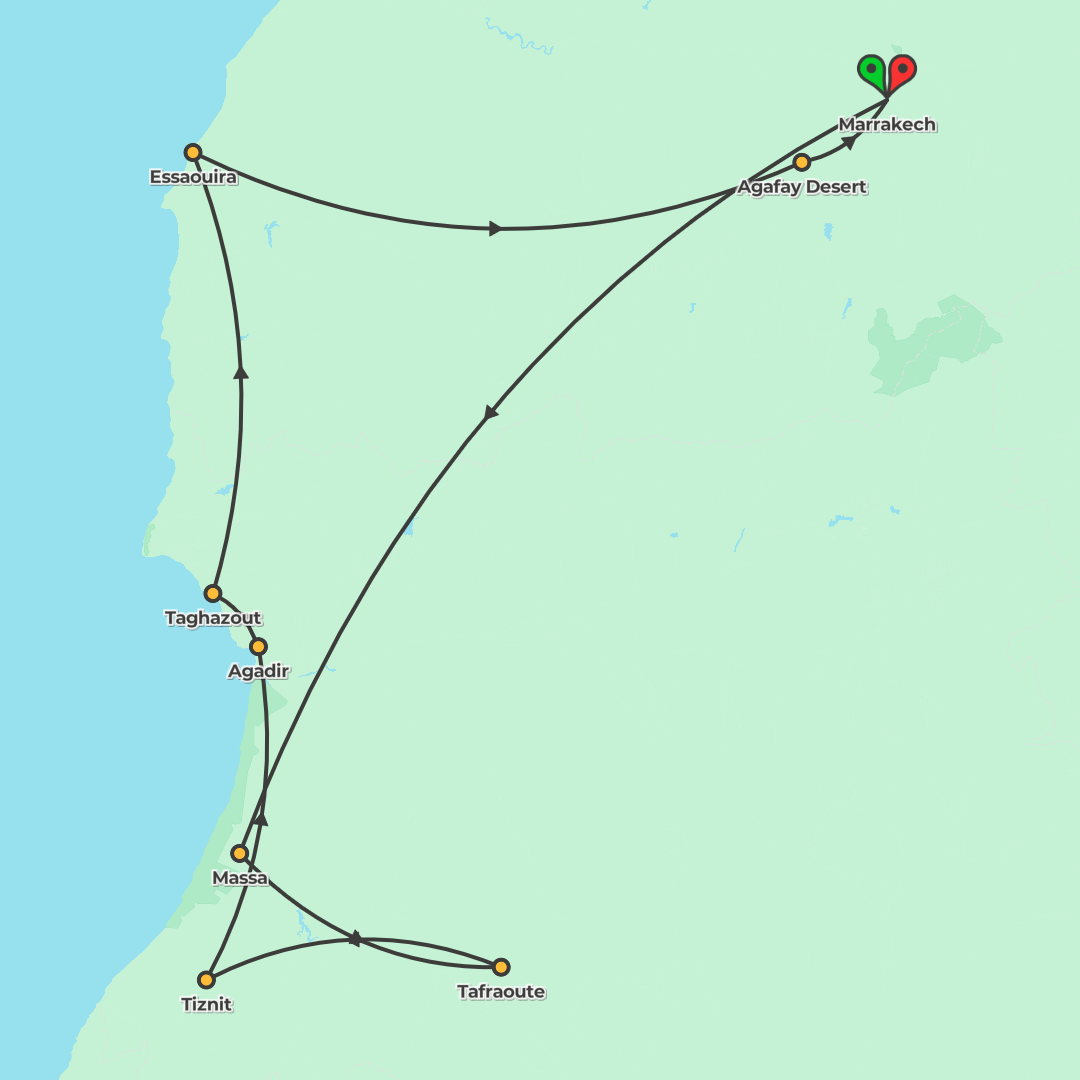 Explore Marrakech, Tafraoute and Essaouira before an atmospheric overnight in the Agafay Desert camp on a guided journey that balances culture, coast and desert.