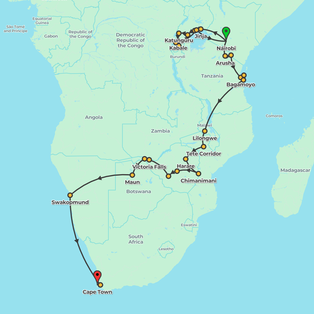 A 76-day Nairobi to Cape Town overland camping adventure across East and Southern Africa, combining wildlife, beaches and deserts with highlights including Zanzibar and Victoria Falls.