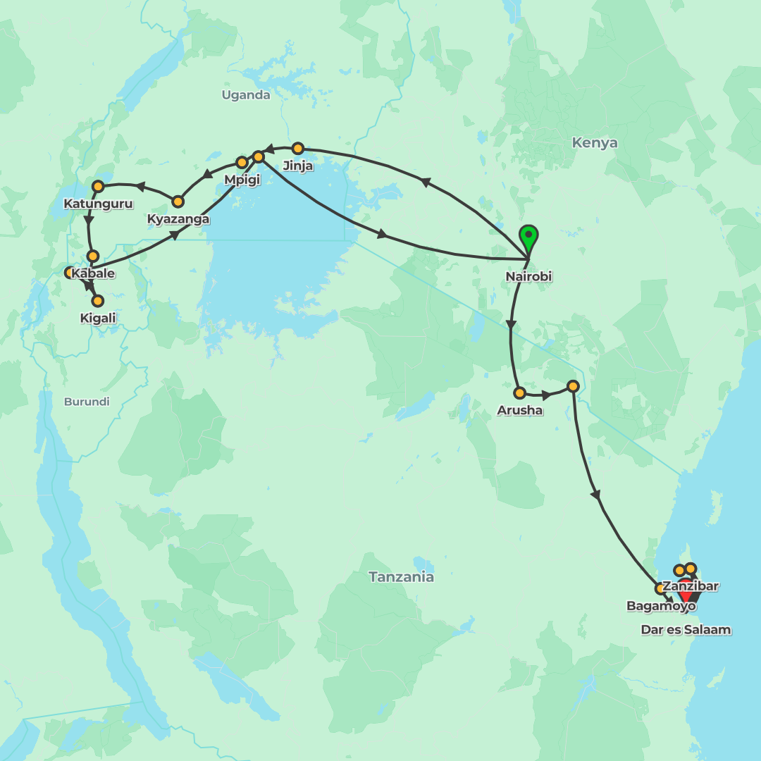 Traverse East Africa on a 34-day overland camping journey from Nairobi to finish in Zanzibar or Dar es Salaam, featuring iconic game parks, primate trekking options, and four nights on Zanzibar’s beac