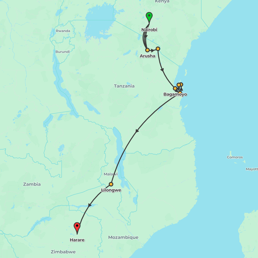 A 24-day Nairobi to Harare overland journey combining mostly camping with simple stays, a Zanzibar ferry and island time, Lake Malawi’s shores, and the option to safari in the Serengeti and Ngorongoro