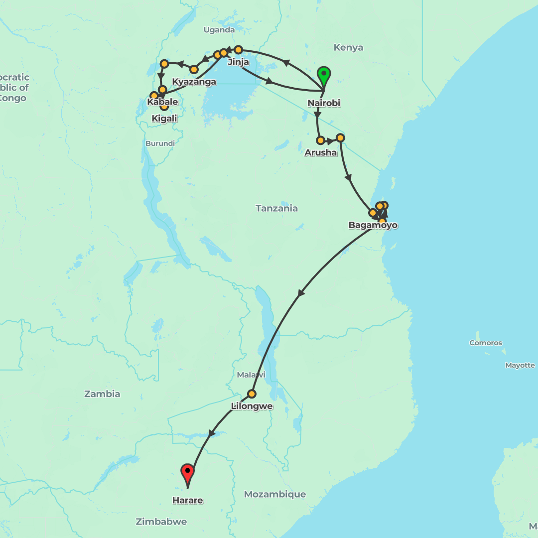 Embark on a 44‑day overland journey from Nairobi to Harare featuring camping, classic game drives, optional primate treks, a Zanzibar stay, and relaxed time on Lake Malawi.