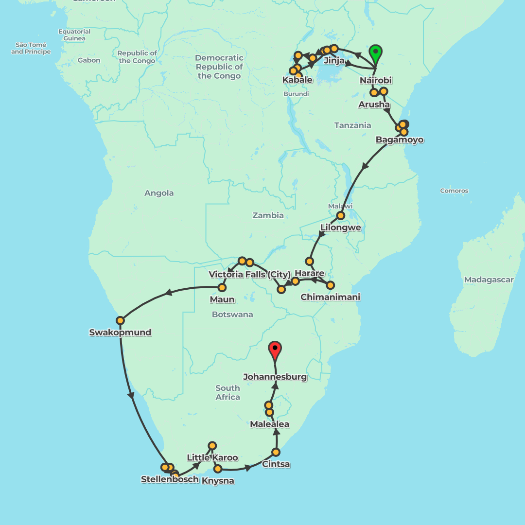 Embark on a 94-day overland journey from Nairobi to Johannesburg, combining iconic wildlife encounters, Zanzibar’s beaches, and unforgettable landscapes across East and Southern Africa.