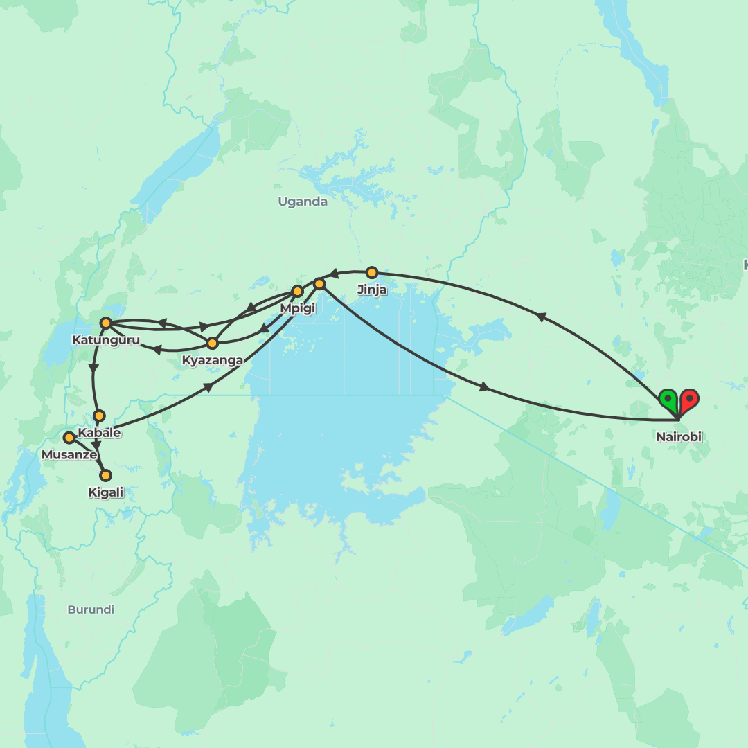 A 20-day Nairobi round-trip camping overland adventure through Kenya, Uganda and Rwanda, featuring Maasai Mara safaris, a Kazinga Channel cruise, and optional gorilla trekking.