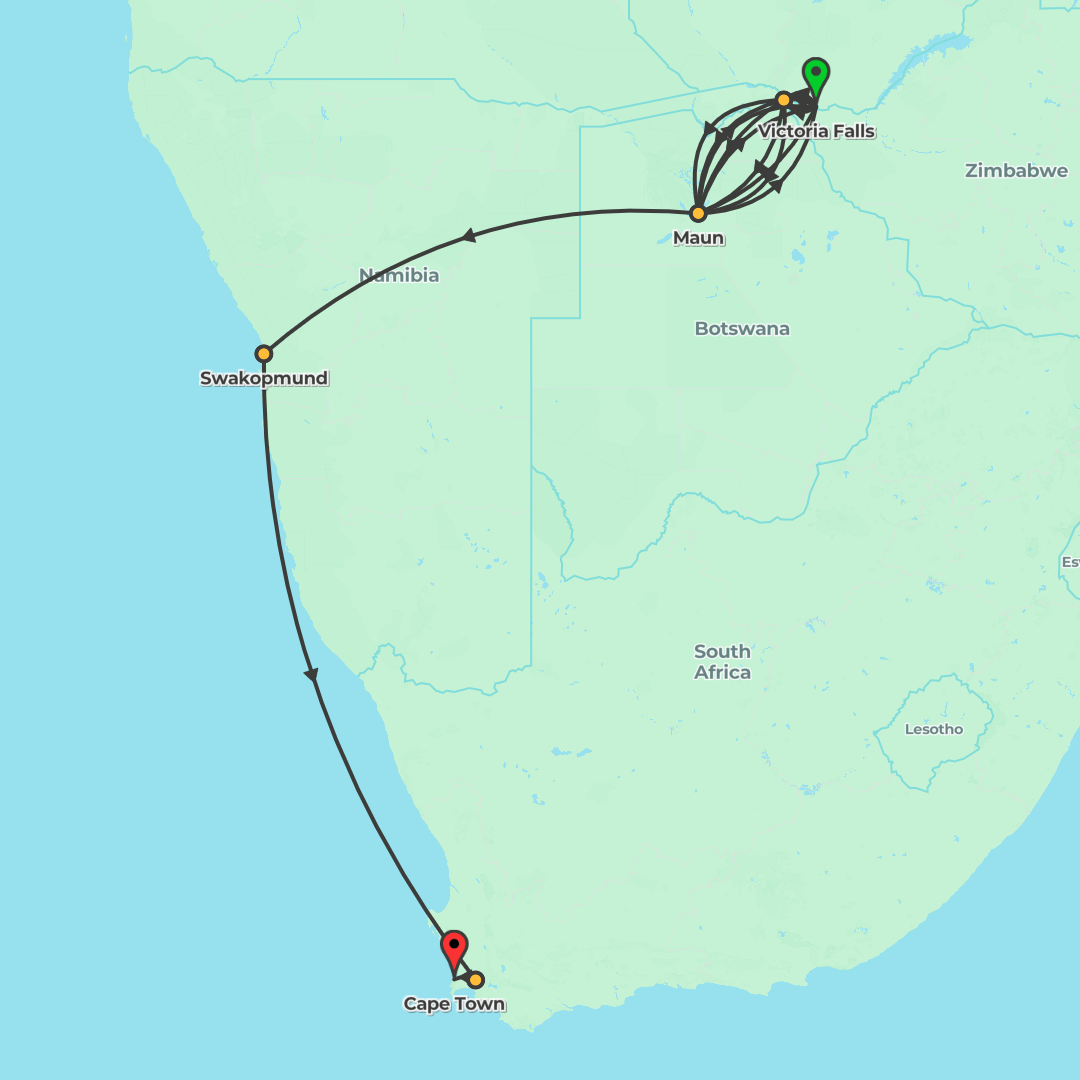 An epic 22-day overland adventure from Victoria Falls to Cape Town through Zimbabwe, Botswana, Namibia and South Africa, combining camping, wildlife, dunes and dramatic landscapes.