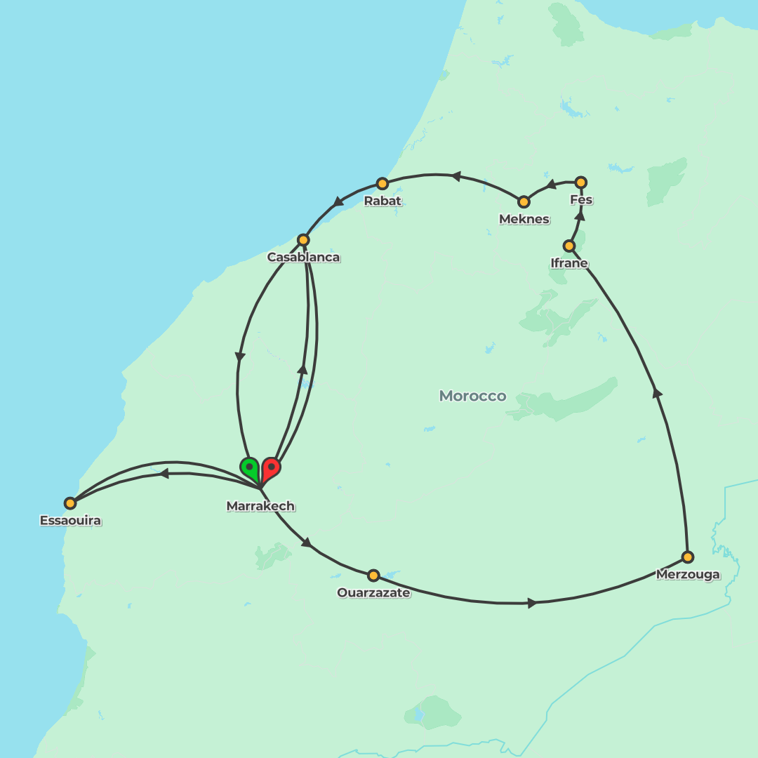 Explore Morocco’s imperial cities, Sahara dunes and Atlantic coast on a 13-day small-group adventure from Marrakech, featuring guided highlights from Casablanca to Fes, a camel trek or Jeep into Erg C