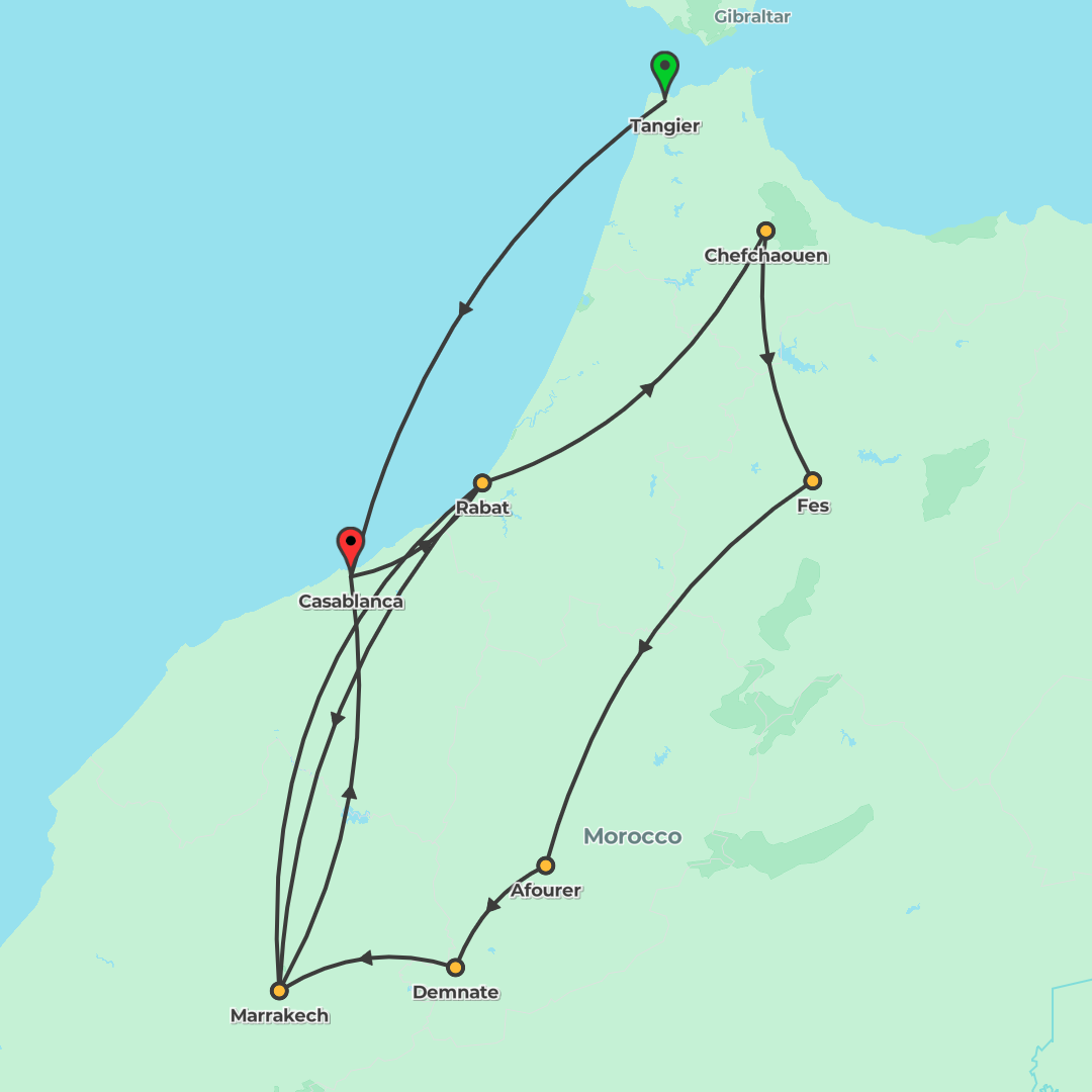A 9-day small group journey from Tangier to Marrakech, featuring imperial cities, the Blue City and mountain scenery with 4-star stays and guided sightseeing.
